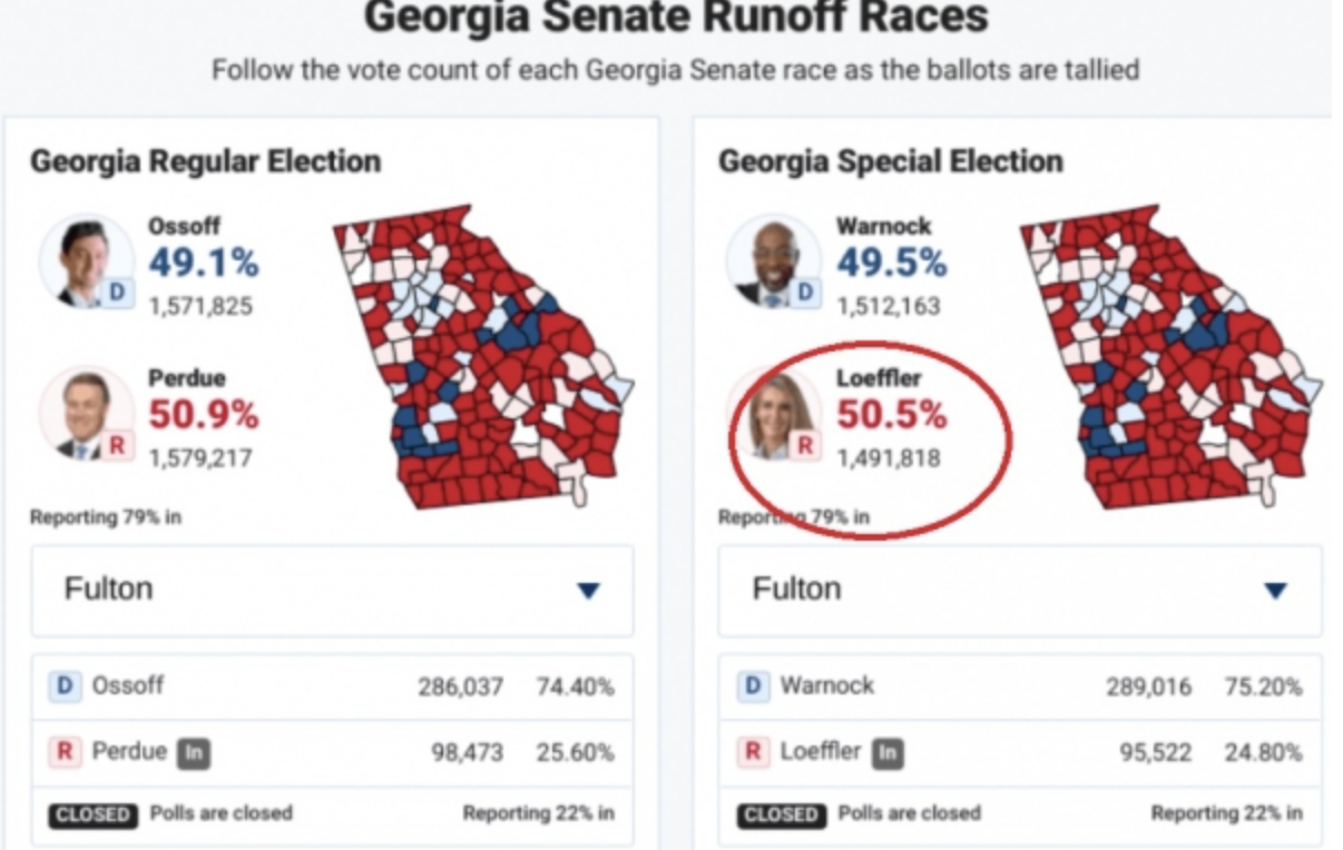 조지아주에는 연방 상원의원 2석이 걸려 있 민주당이 이 지역 2석을 가져악면 총 50석으로 상원 의장을 겸하는 민주당 소속 카멀라 해리스 부통령 당선인을 포함해 다수당이 됩니다.