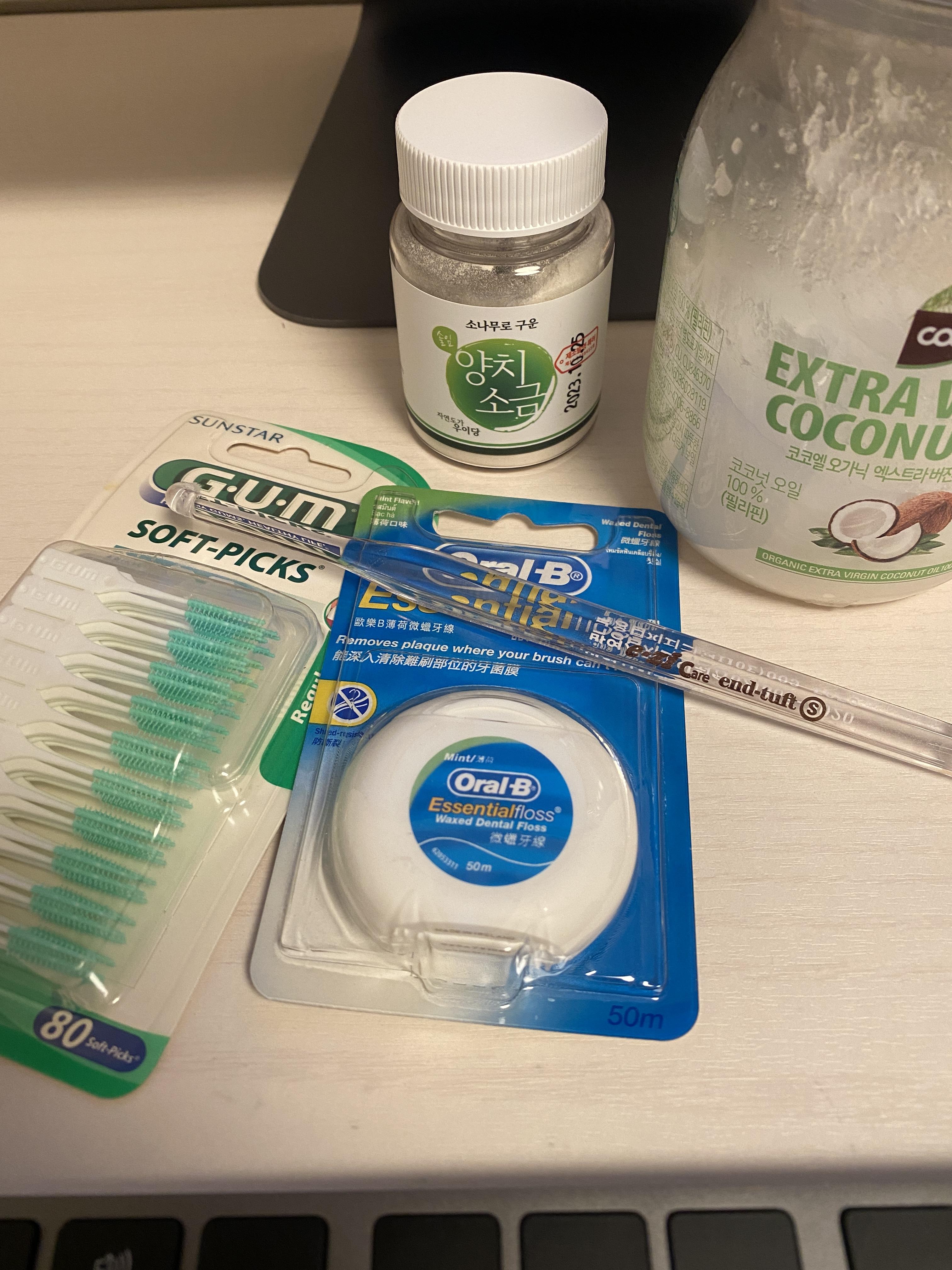 칫솔살균기, 혀클리너, 치간브러쉬 2종류, 치실, 양치소금, 오일풀링으로 치아관리를 하고 있어요.